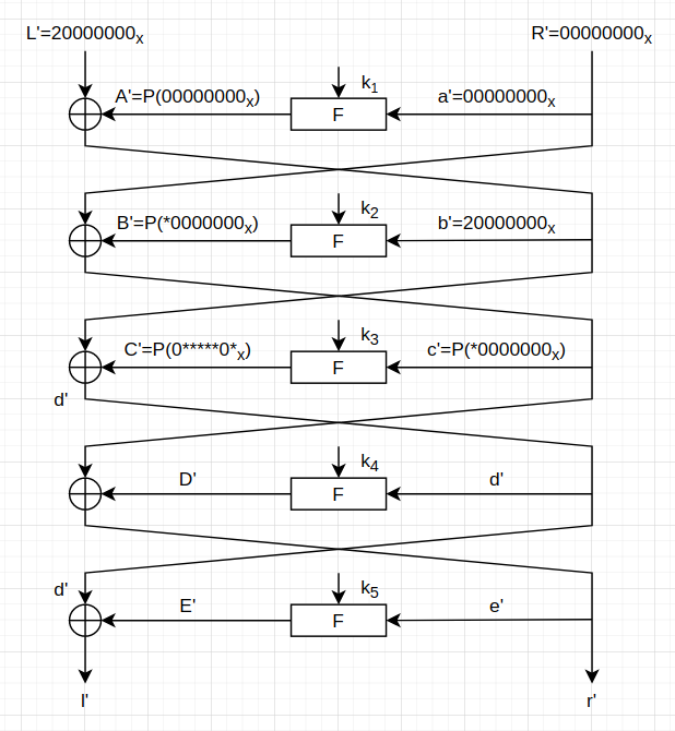 Bytes m1 = engine(); Bytes m2 = m1 ^ d; Bytes c1 = IP(Encrypt(FP(m1), 5)); Bytes c2 = IP(Encrypt(FP(m2), 5)); Bytes e = c1 ^ c2; Bytes L = d >> 32; Bytes l = e >> 32; Bytes r = e ^ l << 32; Bytes a1 = Block(Expand(c1 & ((1ULL << 32) - 1)), 6, x); Analyse(x, Block(Expand(r), 6, x), Block(ReP(l ^ L), 4, x), mflag); for (int i = 0; i < 64; i++) { if (kflag[i] && !mflag[a1 ^ i]) { kflag[i] = 0; cnt--; } }