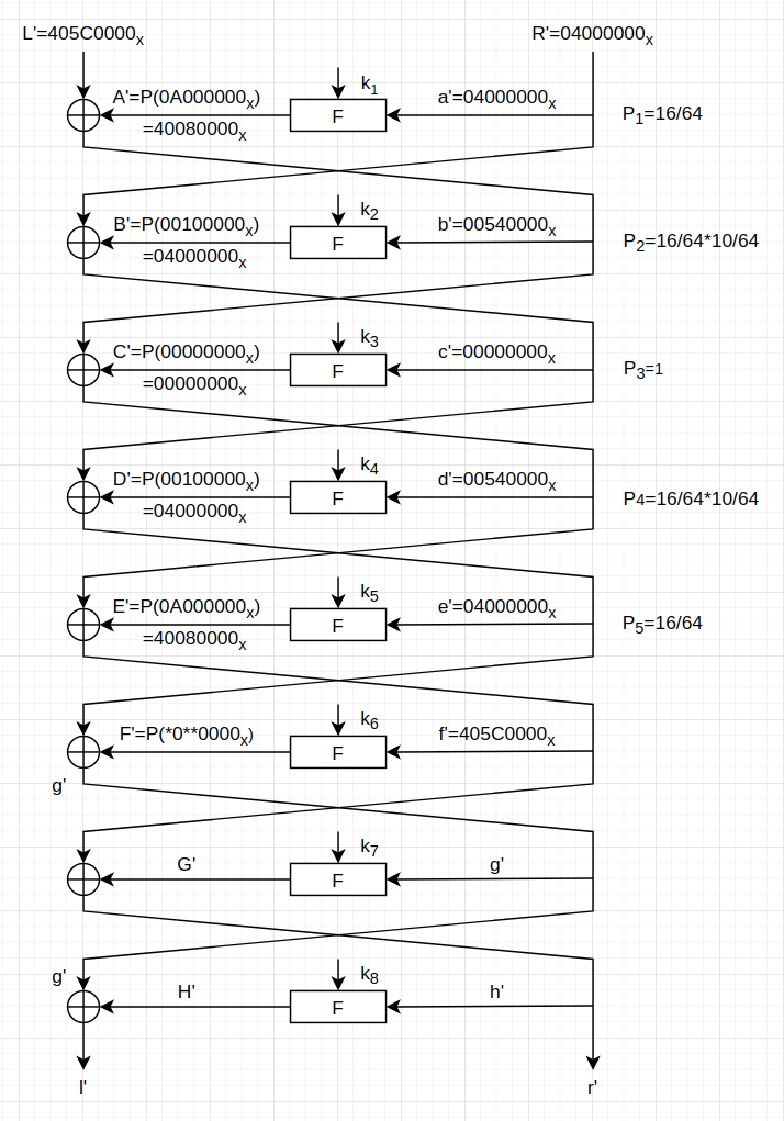 对 8 轮 DES 的攻击也从选择差分路径开始。这次我们选择 (405C0000x,04000000x) 作为输入差分。它的差分路径和差分特征概率如图: