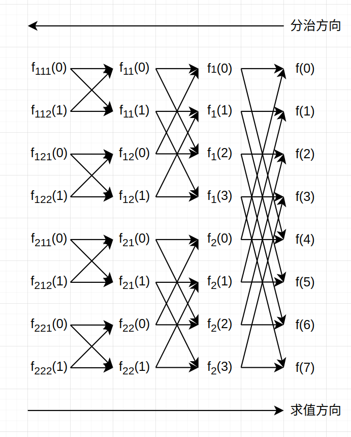 许多读者可能仍然对分治的过程不太理解,不能想象为什么这样分治可以求出对于 k=0,1,⋯,N−1 的所有值。所以我将画图来解释这个过程,以 N=8 为例:
