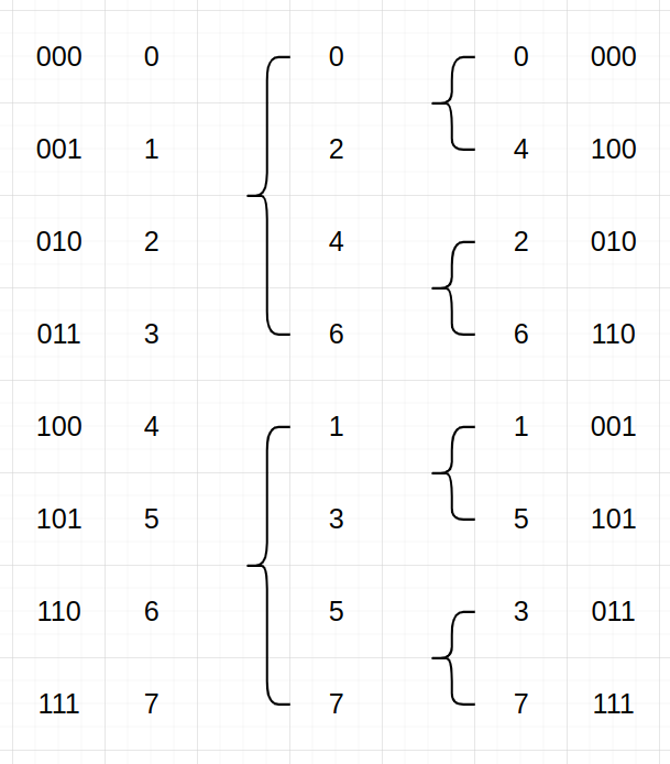 可以发现,分治的最底层的标号二进制位,恰好是原标号的二进制位的镜像!